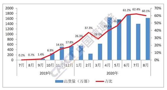 5G手機方面,2020 年 8 月,國內(nèi)市場 5G 手機出貨量 1617.0 萬部,占同期手機出貨量的 60.1%;上市新機型 22 款,占同期手機上市新機型數(shù)量的 48.9%。1-8 月,國內(nèi)市場 5G 手機累計出貨量 9367.9 萬部、上市新機型累計 141 款,占比分別為 46.3% 和 46.8%。