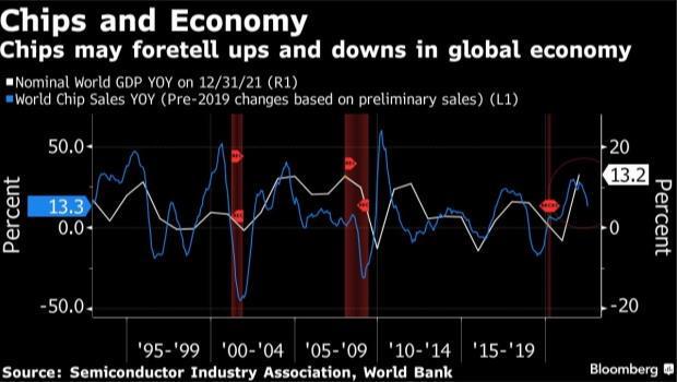 芯片銷售之所以開始降溫,是因?yàn)楦鲊胄虚_始爭相加息以對抗螺旋式上升的通脹。彭博經(jīng)濟(jì)(Bloomberg Economics)進(jìn)行的一項(xiàng)全球跟蹤顯示,今年世界經(jīng)濟(jì)前景迅速惡化,芯片銷售也隨之放緩。