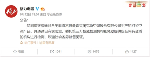 就在昨天,格力電器官方微博發(fā)布最新公告,表示繼續(xù)通過各類渠道不限量購買奧克斯空調(diào)股份有限公司生產(chǎn)的相關(guān)空調(diào)產(chǎn)品,并通過自有實驗室、委托第三方權(quán)威檢測機構(gòu)和免費提供給任何有資質(zhì)的機構(gòu)進行檢測,歡迎社會各界監(jiān)督見證。